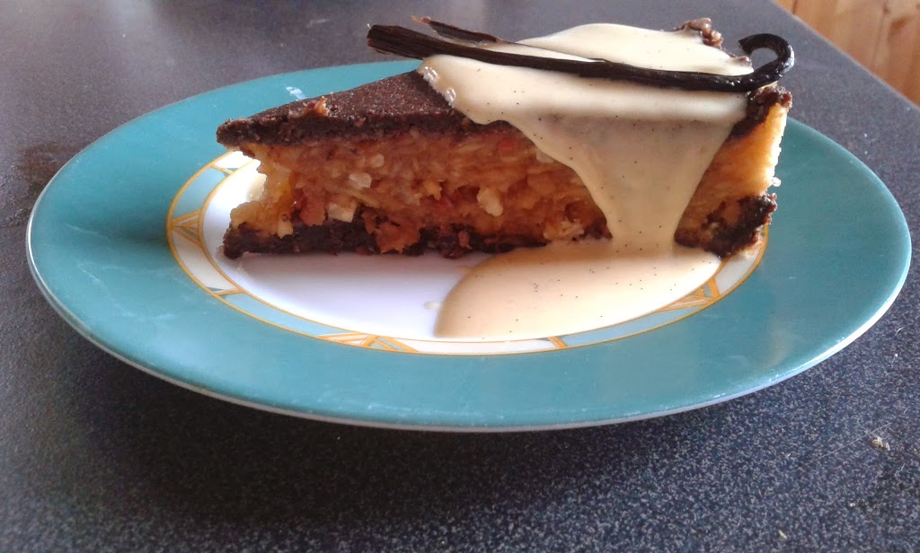 Egy csatos tortaformába beleformázom a tészta felét, és kicsit kinyomkodva beletöltöm a reszelt almát. A tészta másik felét ráformázom a tetejére.