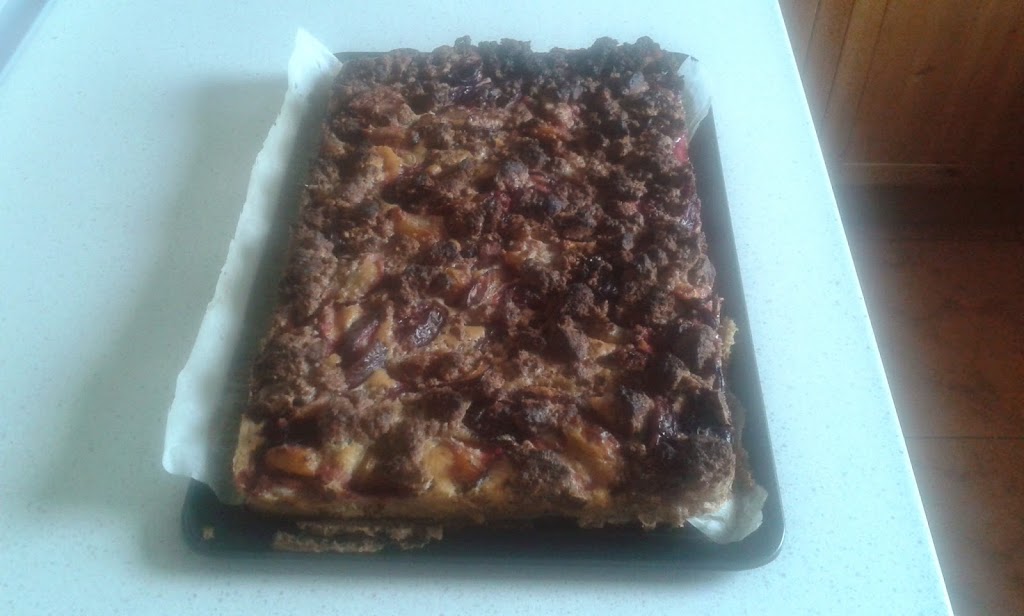 4.Ha a tészta megsült a feldarabolt szilvákat szép sorban ráhelyezzük, majd az öntetet ráöntjük és a megmaradt 1/3 tésztát a tetejére morzsoljuk.