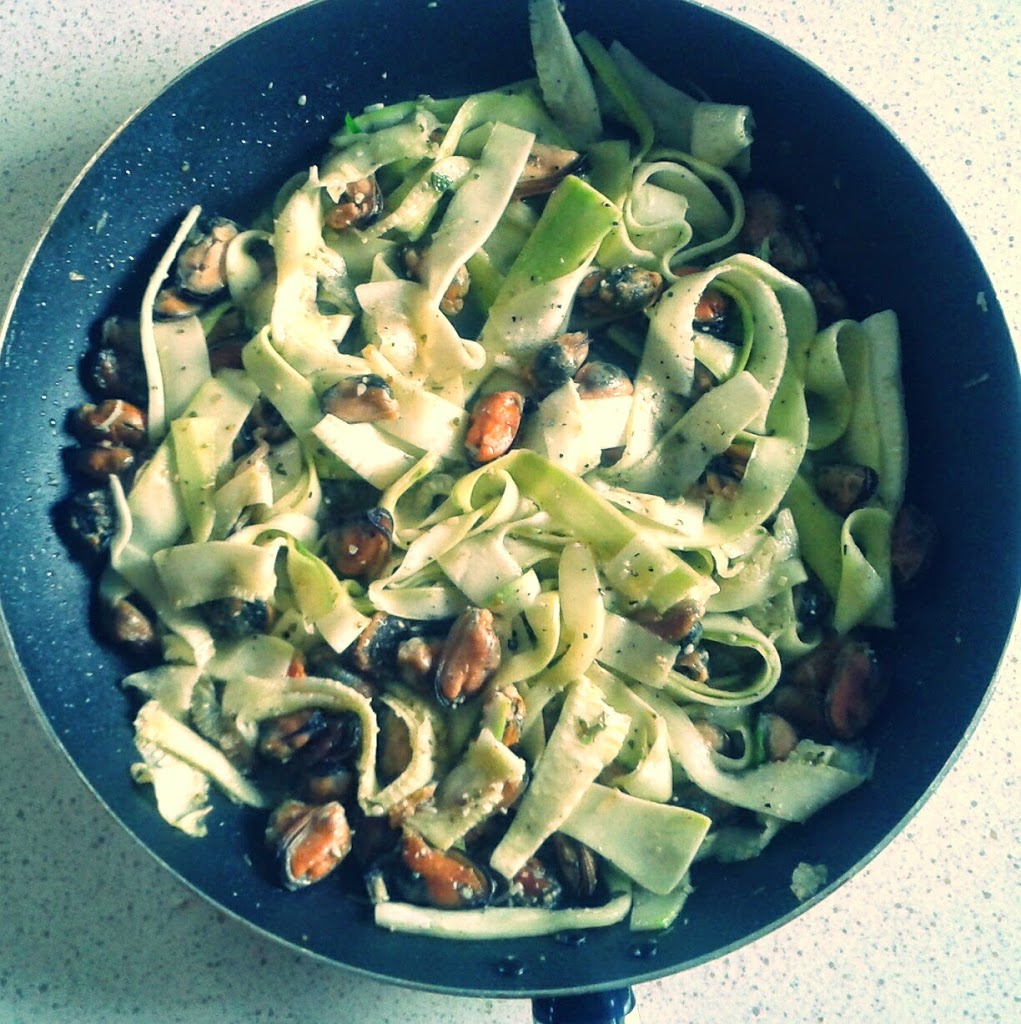 A fagyasztott kagylót beledobtam egy felforrósított kókuszzsíros serpenyőbe. Belenyomtam két gerezd foghagymát,1 citromot, fűszereztem, és a legvégén beleforgattam a gyalult cukkinit.