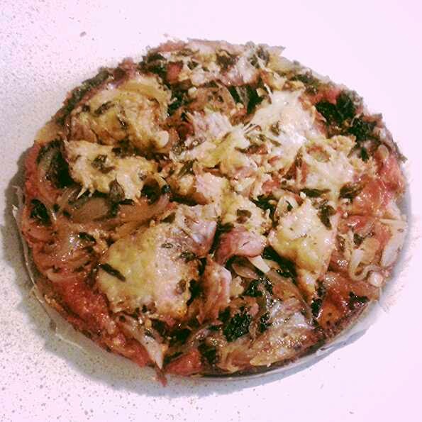 Egy fél paradicsom konzervet összeaprítottam, fűszereztem pici sóval, oregánóval, bazsalikommal. Ez lett a pizzaszósz. Ráöntöttem a megsült tésztára, utána a megdinsztelt hagymás spenótos keveréket is. A tetejére egy kis sonka és parmezán sajt került friss bazsalikommal.
